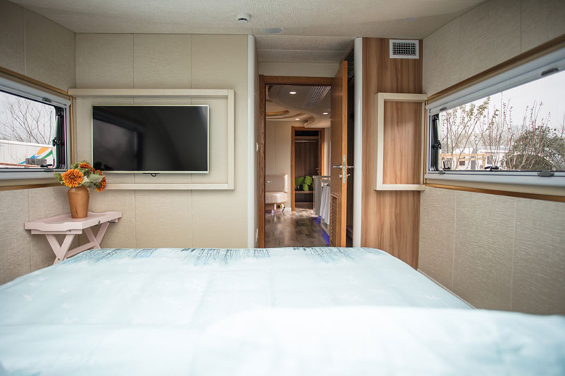 10米房车内有2个卧室(一张1.8米*2米床、一张1.2*2米床)、一个客厅及一个淋浴间,适合一家三口居住,同时主卧还配备了一扇3.7平米的全景式观景天窗,夜幕降临之时可享躺在床上看星星的乐趣。
